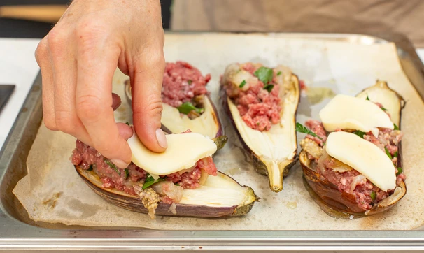 Баклажаны, запечённые с говяжьим фаршем и сыром