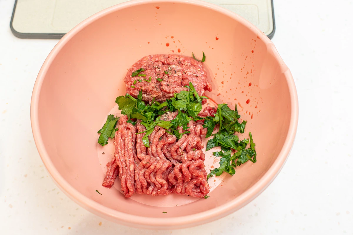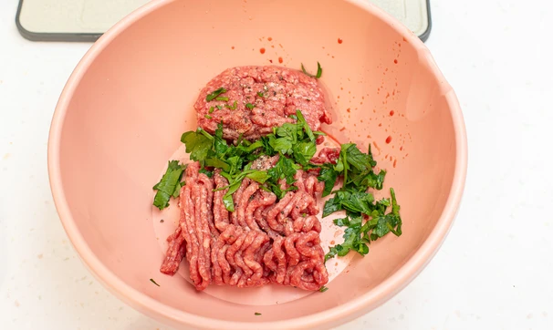 Выложите в миску фарш. Посолите, поперчите по вкусу.