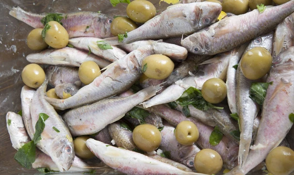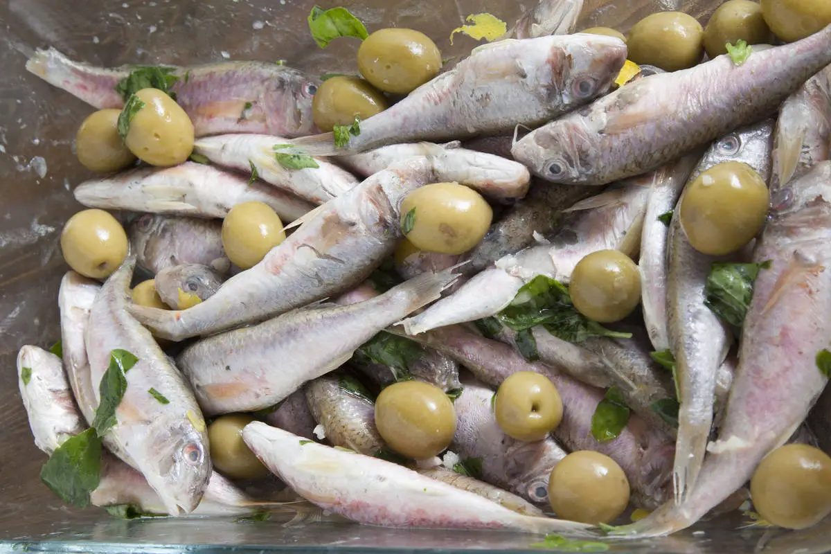 Барабулька в лимонном соусе с оливками