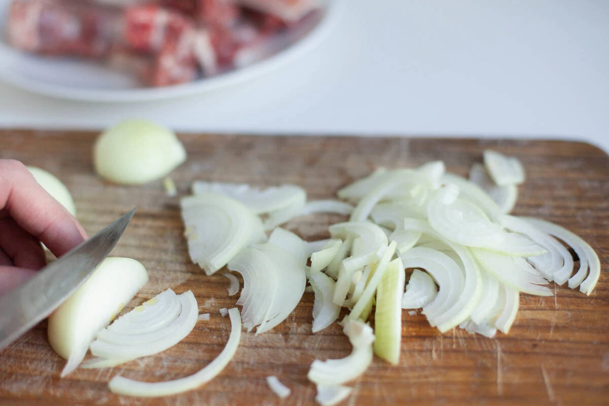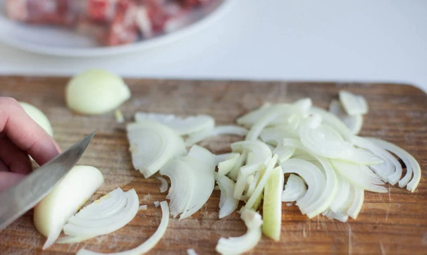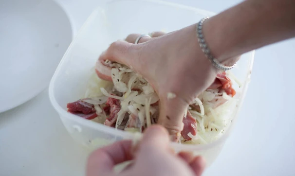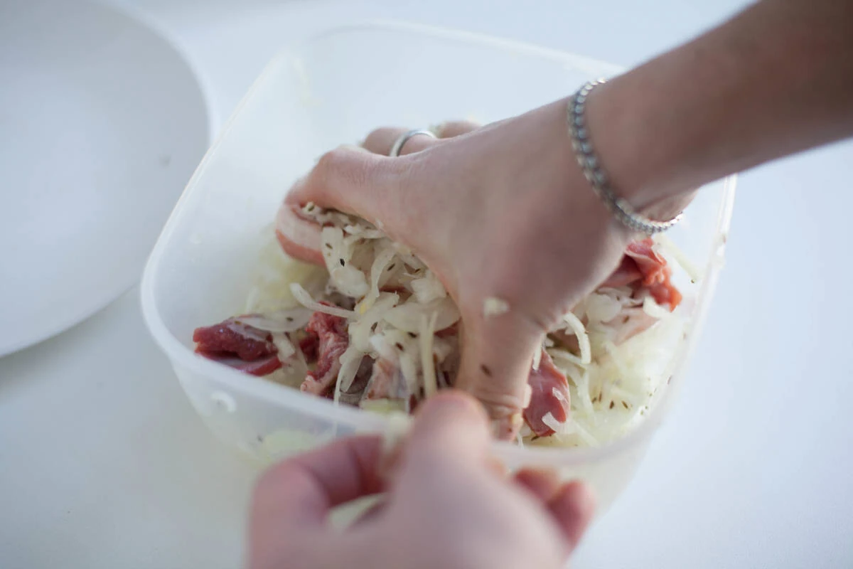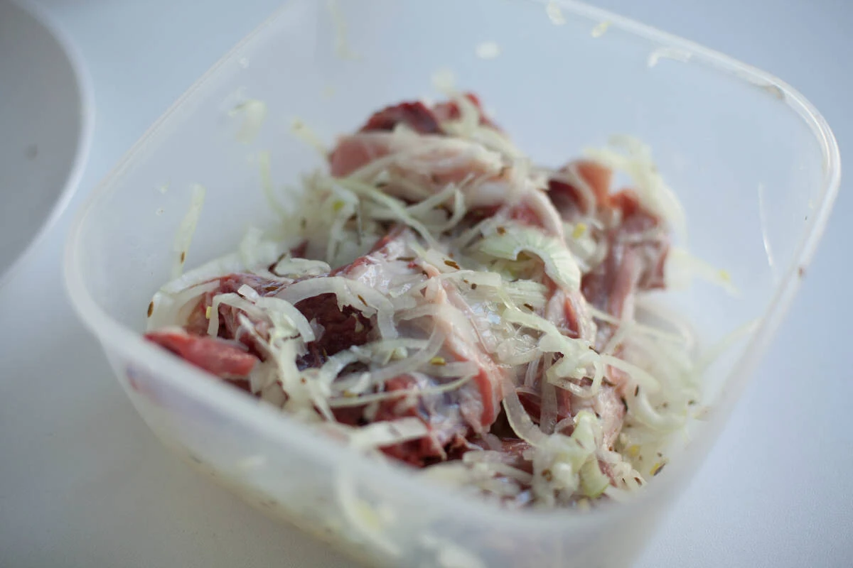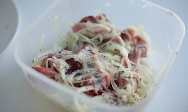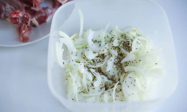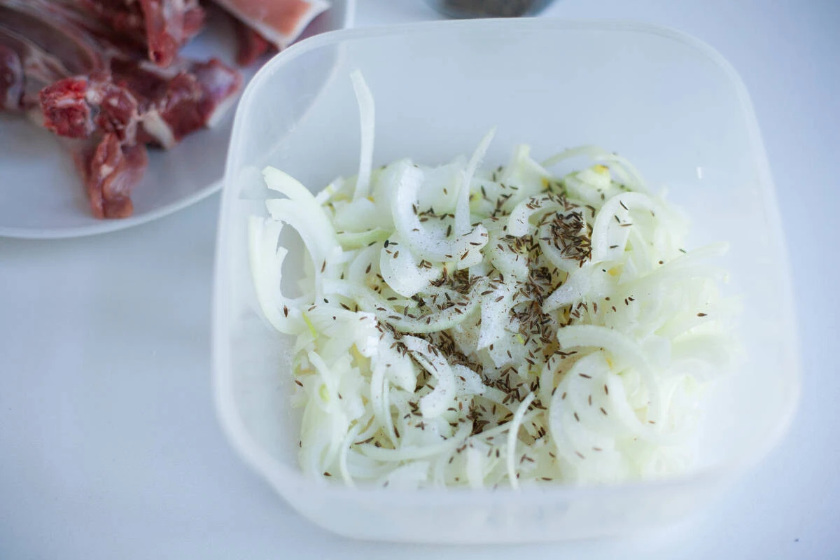Баранью корейку разрежьте на косточки, выложите к луку, перемешайте, закройте контейнер. Дальше можно заниматься мангалом, корейка должна мариноваться при комнатной температуре от получаса до двух часов.