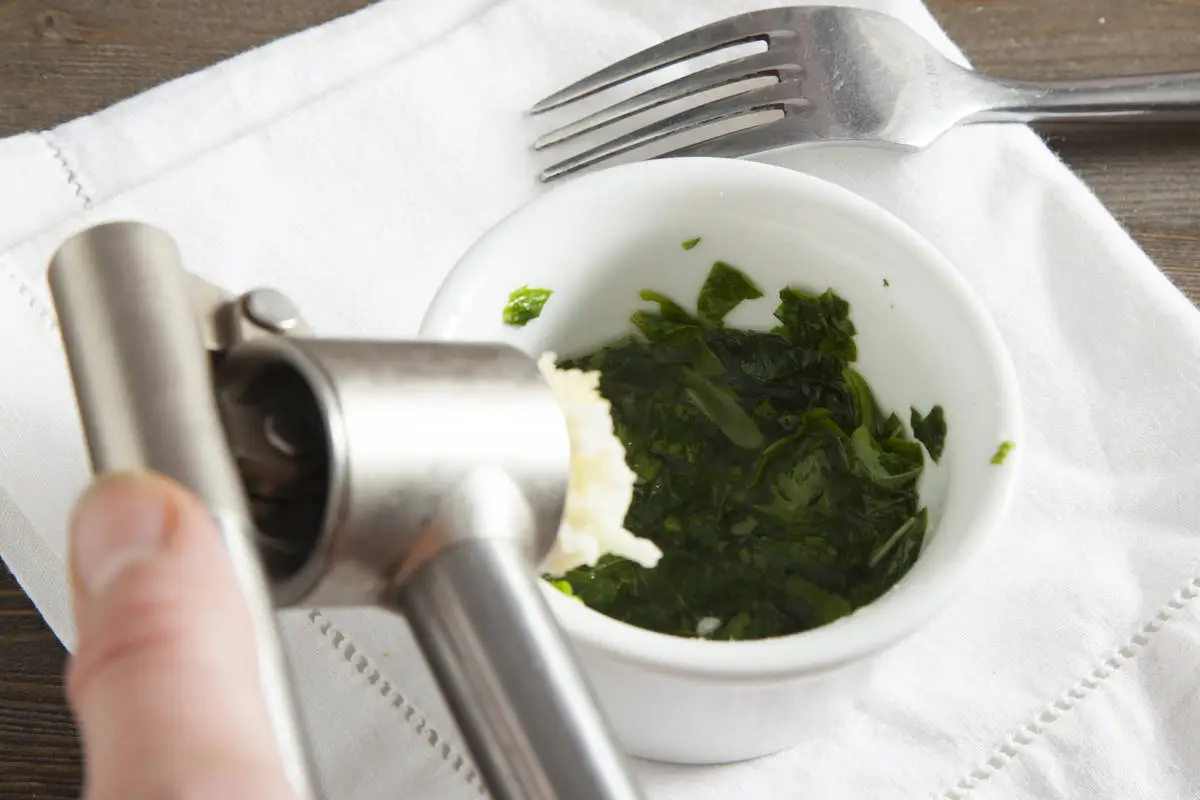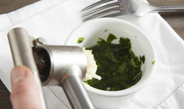 Листья базилика растолките при помощи ступки, добавьте сок лимона, соль, перец и пропущенный через пресс чеснок, перемешайте.