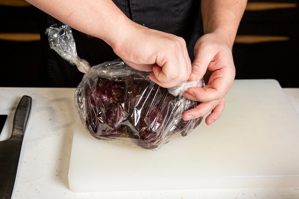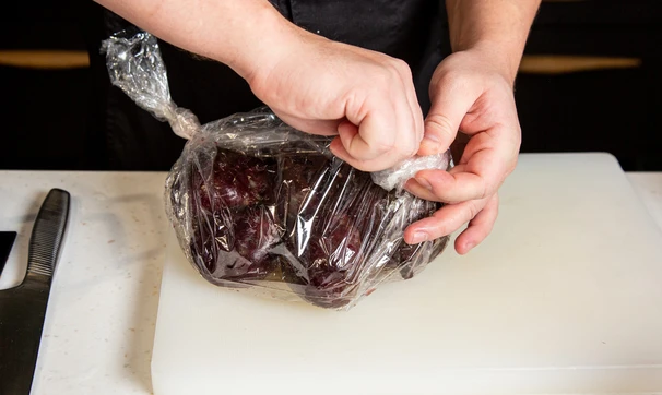 Свёклу заверните в рукав для запекания и готовьте в духовке до мягкости при температуре 180 градусов. Это можно сделать заранее и хранить затем овощи в холодильнике 1–2 дня.