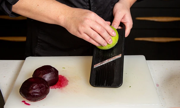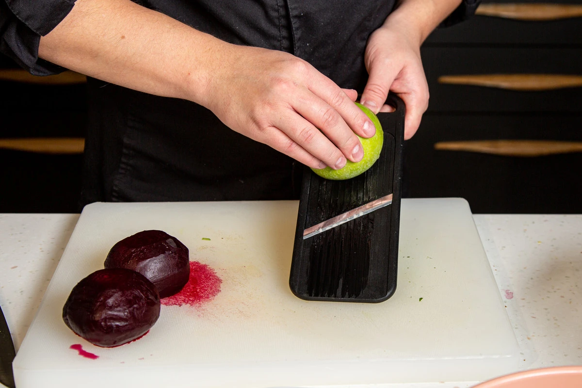 Яблоки и свёклу нарежьте тонкими кружками, сбрызните лимонным соком.