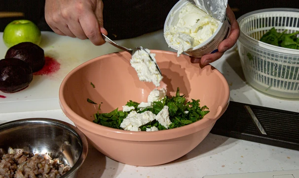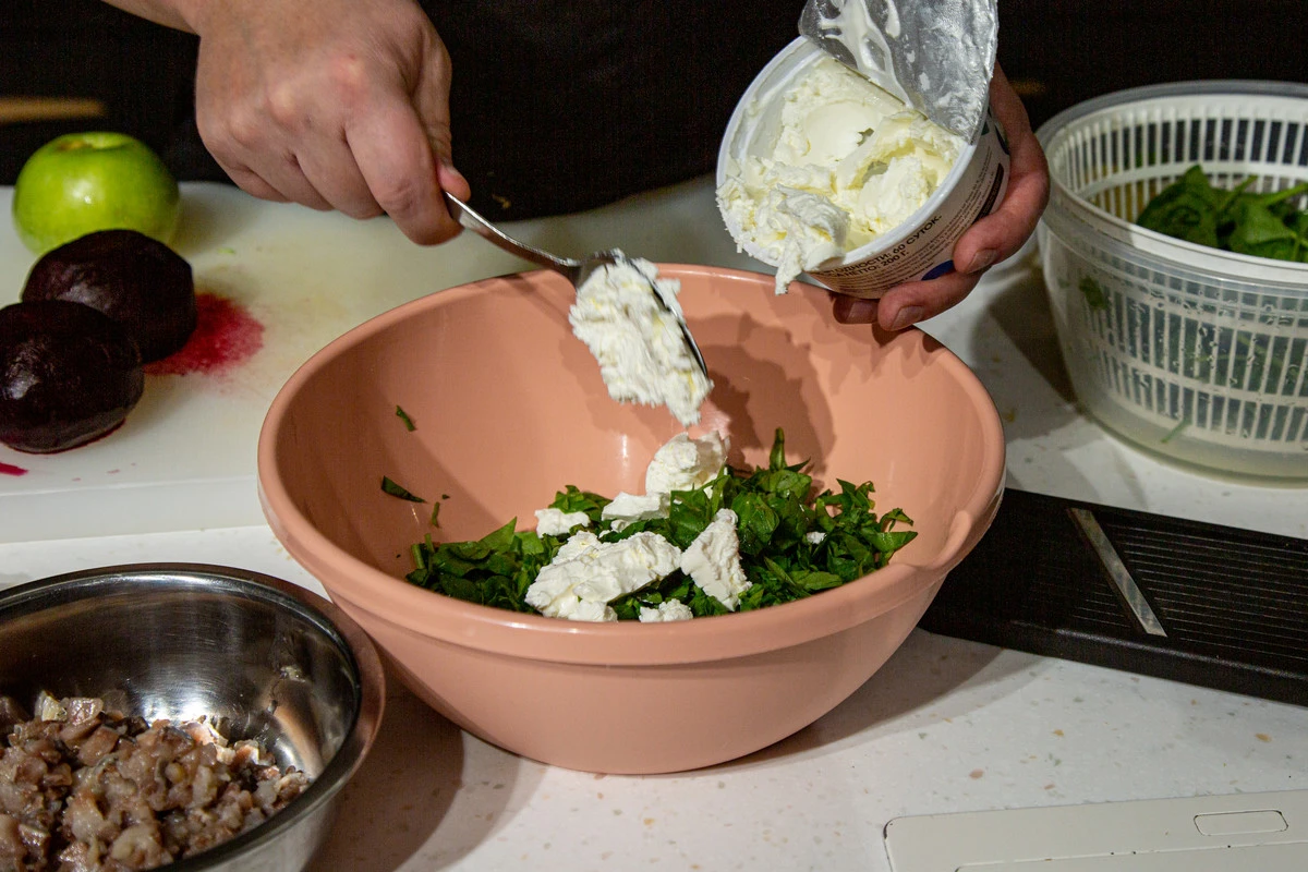 Шпинат мелко порубите и смешайте с крем-чизом.