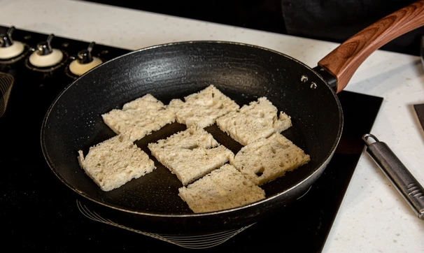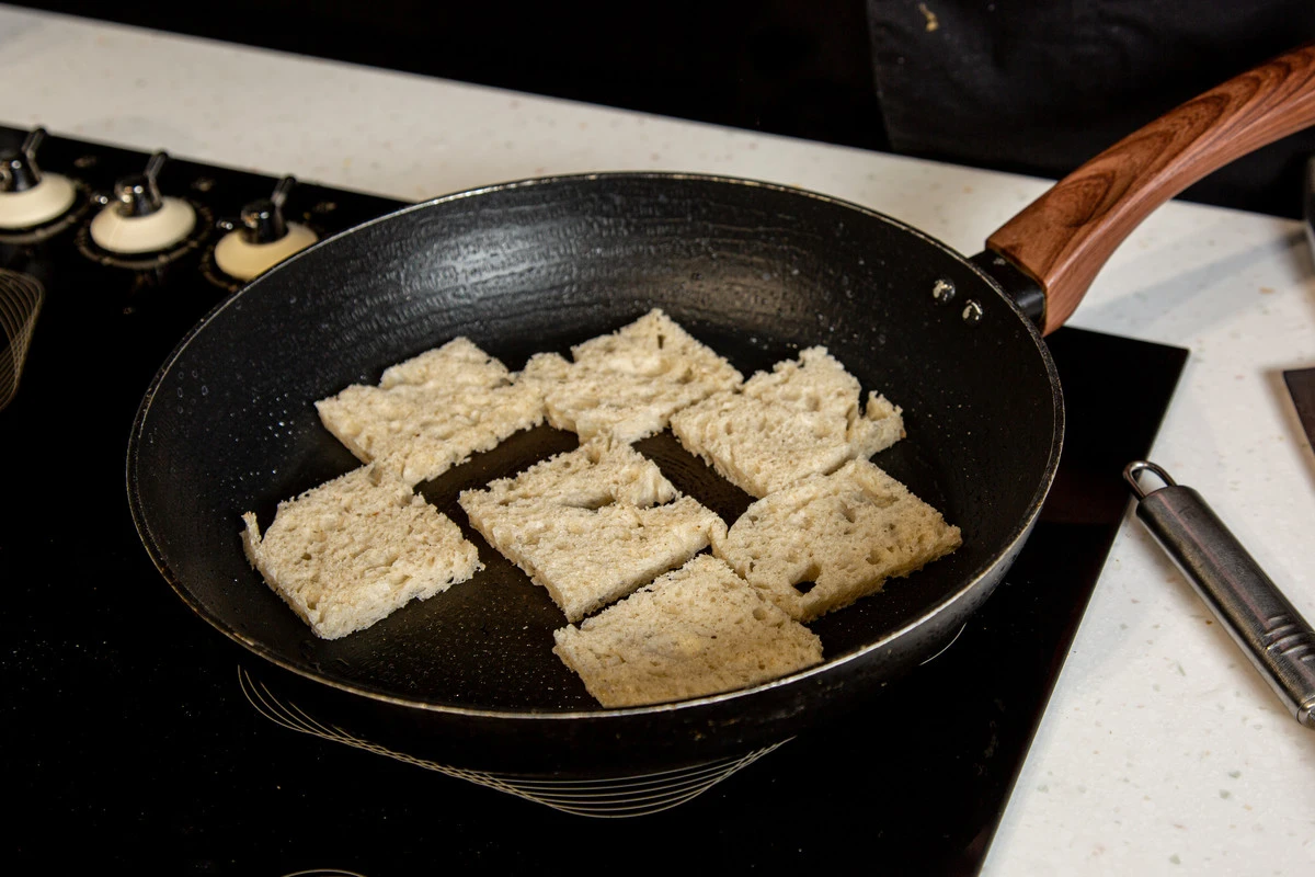 Из хлеба вырежьте квадратики по размеру свекольных кружков и слегка поджарьте на сухой сковороде.