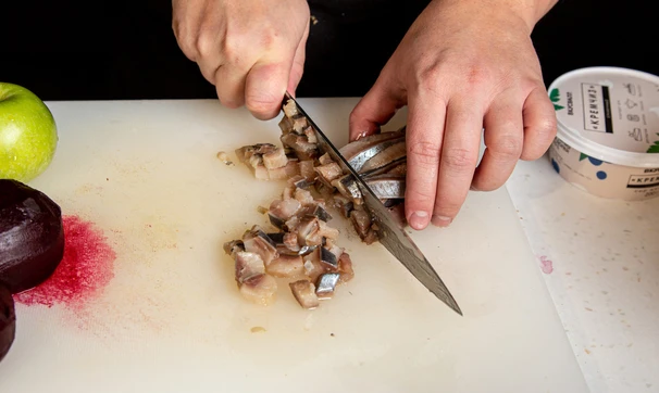 Селёдку нарежьте небольшими ломтиками.