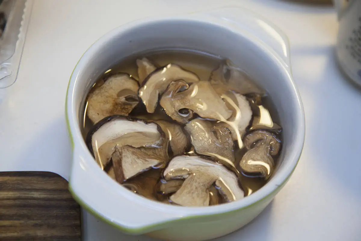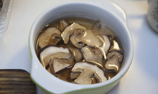 Сушеные грибы залейте стаканом кипятка, отставьте.