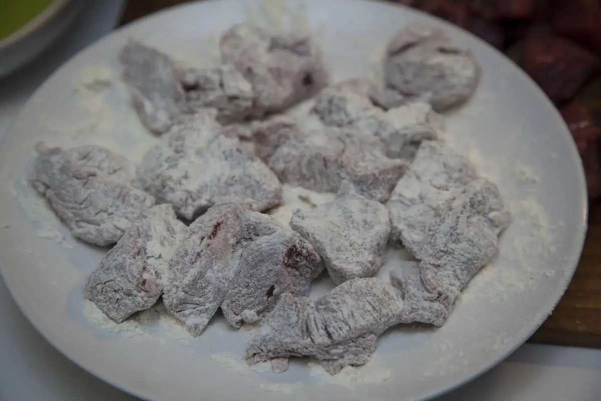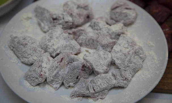 Обваляйте мясо в муке, стряхните излишек.