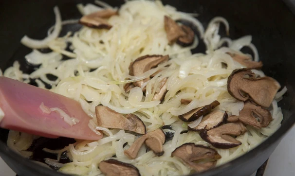 Лук нарежьте тонкими полукольцами. Выложите мясо на тарелку, на оставшемся масле обжарьте лук до прозрачности, добавьте грибы, жарьте еще минуту.