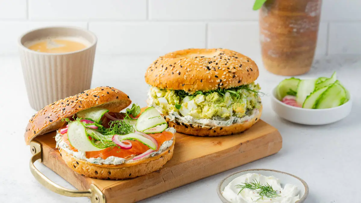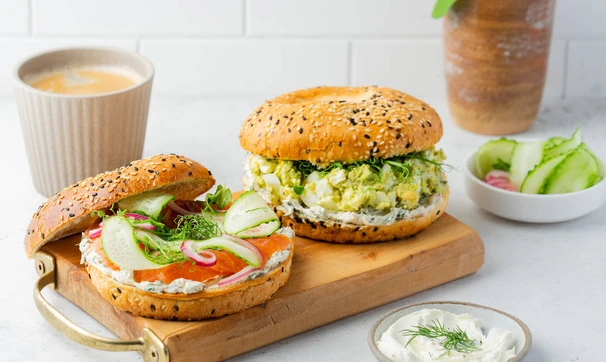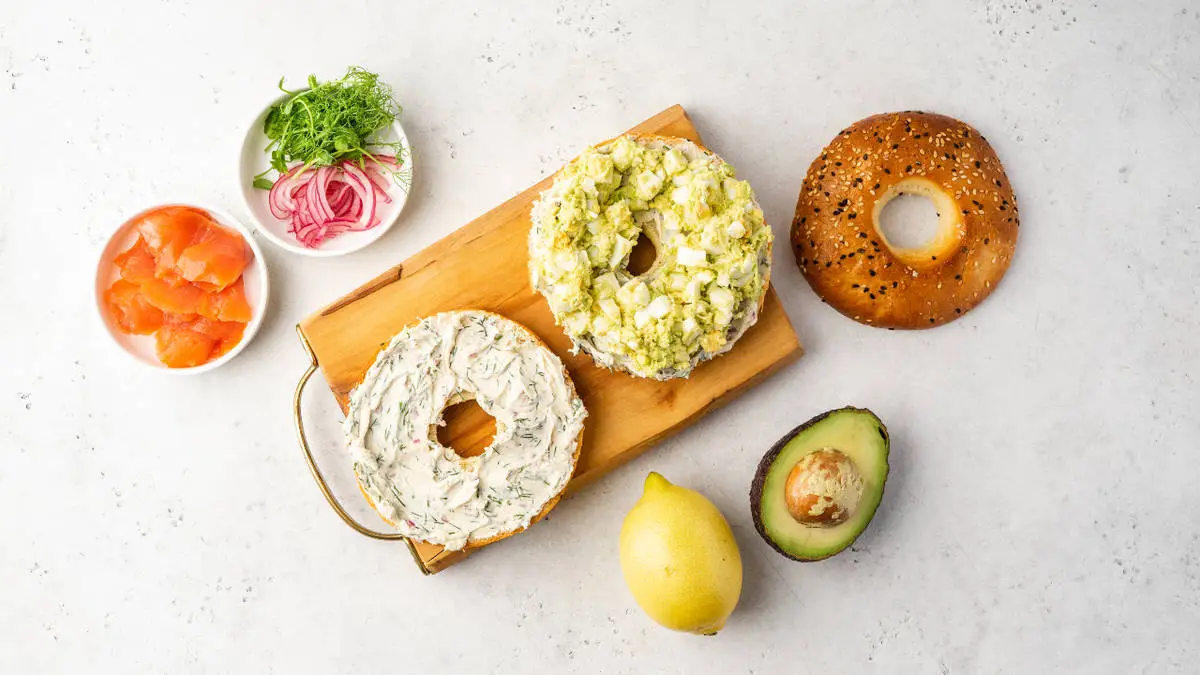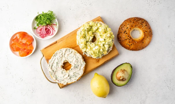 Приготовим 2 варианта начинки для бейглов — яичный салат с авокадо и малосольная форель с луком и огурцом.