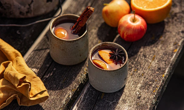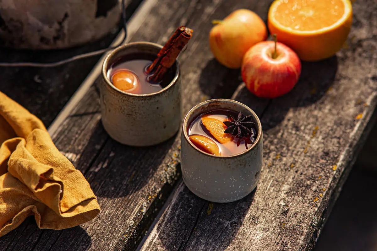 Ароматный, в меру терпкий и очень вкусный безалкогольный глинтвейн получается из смеси яблочного и гранатового сока. Конечно, на живом огне на природе получится особенно вкусно.