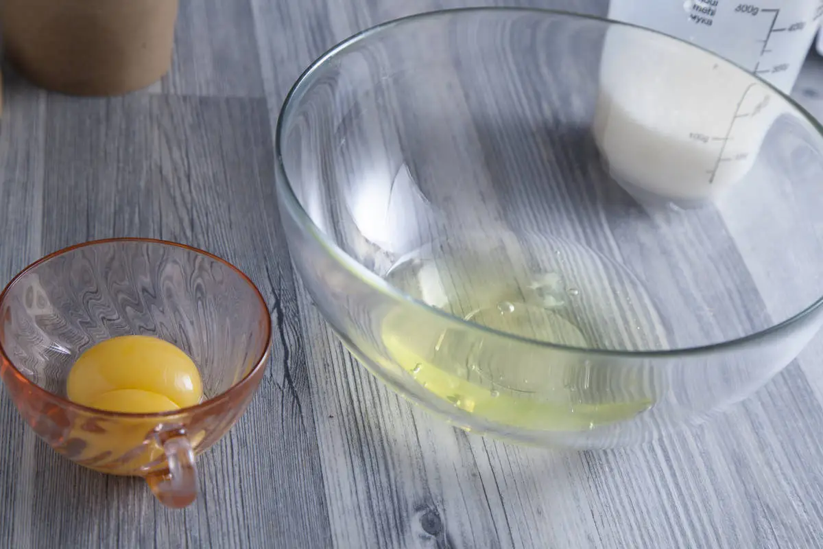 Аккуратно отделите белки от желтков, желтки не понадобятся. Белки поместите в большую сухую миску, взбивайте миксером на максимальной мощности до устойчивых пиков, затем всыпьте сахар (желательно использовать мелкокристаллический белый сахар) и взбивайте до плотности и блеска.