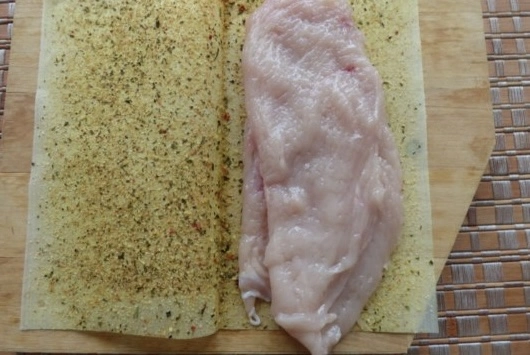 Возьмите грудку, разрежьте каждую на половину (чтобы кусочек был тоньше). Можно также отбить. Заверните в листы для жарки. Я брала томатные. В таком виде их нужно поставить в мультивару или духовку на час.