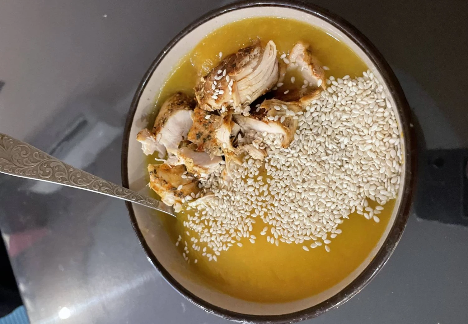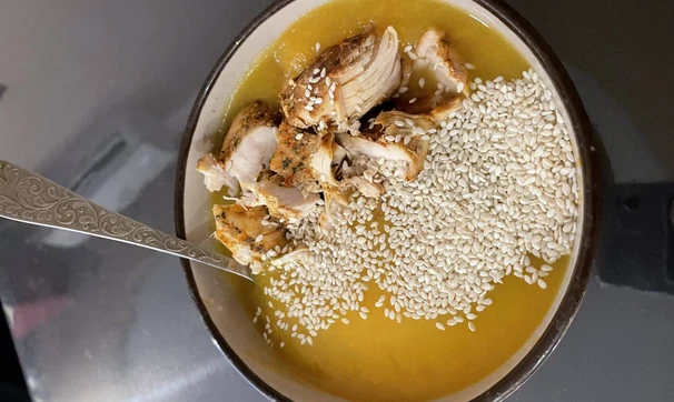 Когда овощи сварились, слейте часть бульона. Остальное пробейте блендером для однородности. Секретный ингредиент данного супа (ведь он без сливок) — это половина пачки вегамасла. Вы можете добавить меньше, если для вас этого много. Всё, суп готов! Нужно только порезать курочку и добавить в суп.