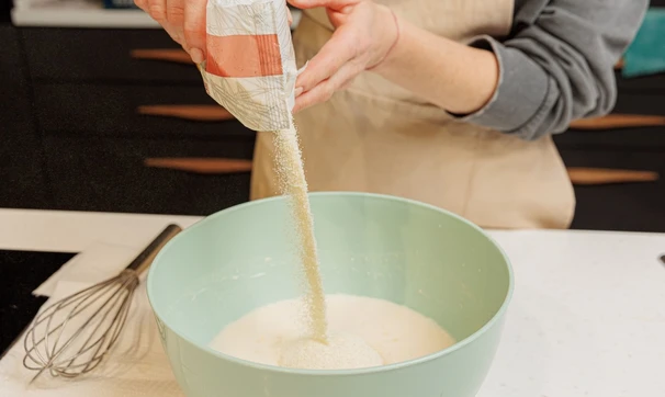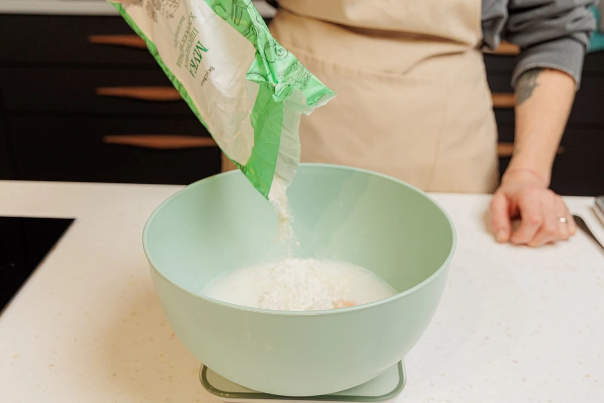 Добавьте сахар, соль и муку.