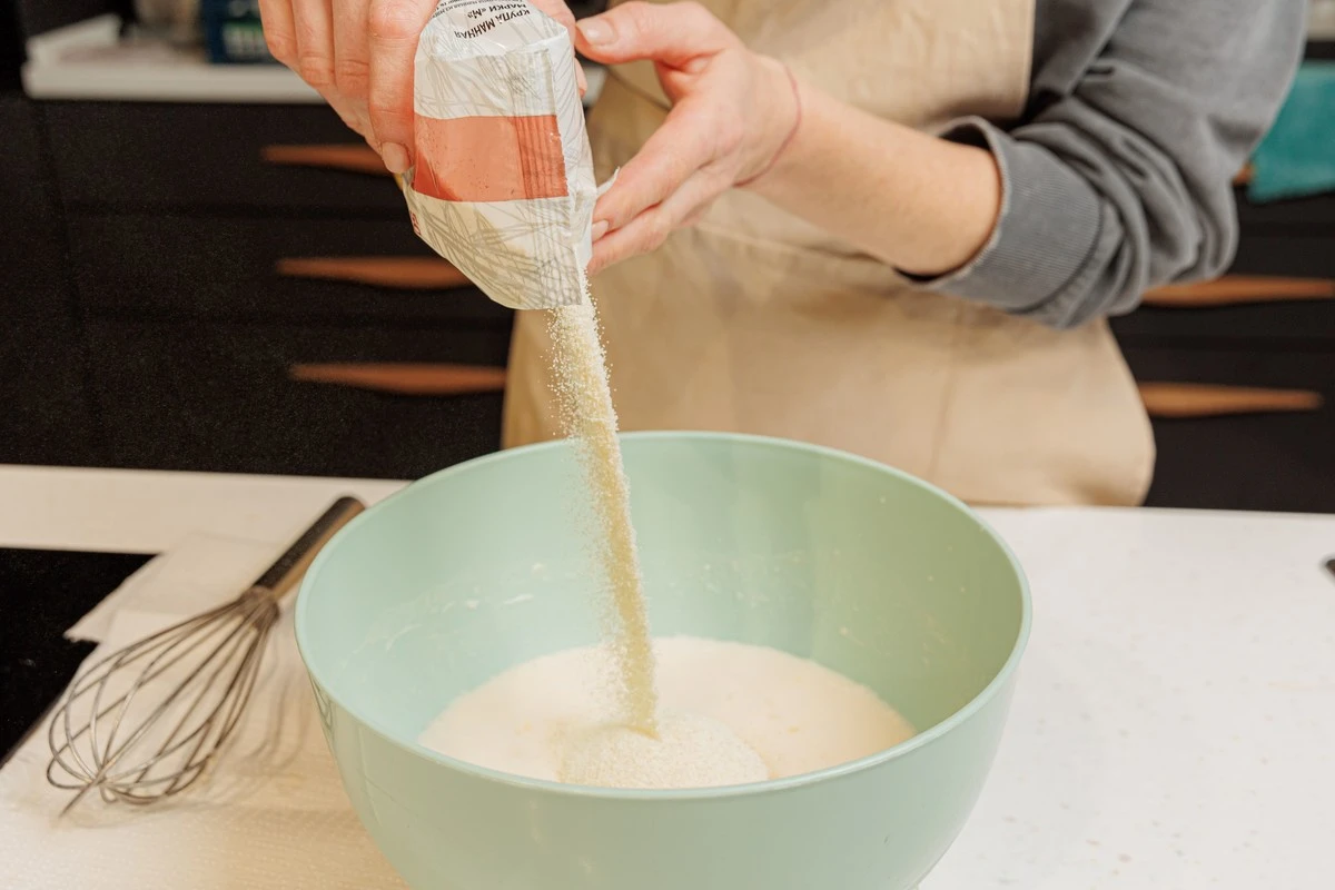 Добавьте манку и сливочное масло комнатной температуры или растопленное. Снова тщательно смешайте венчиком до однородности. Оставьте тесто на час.