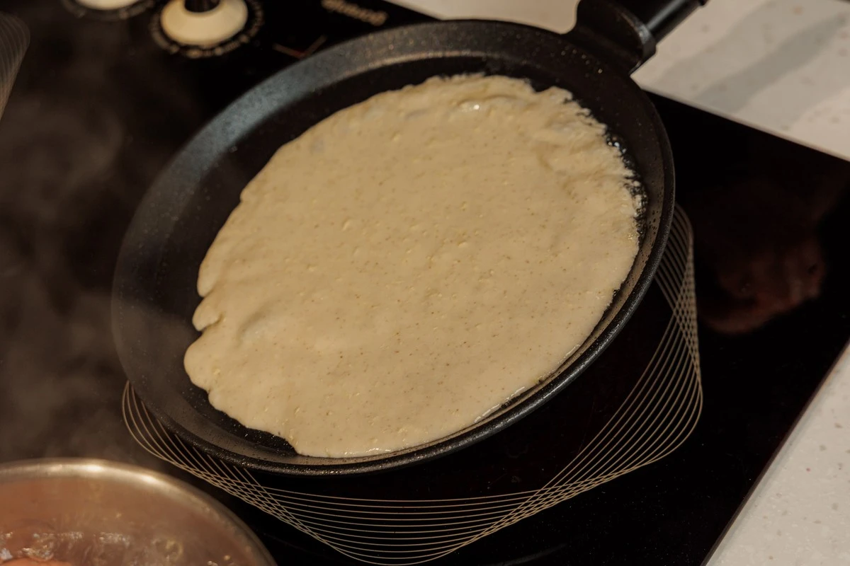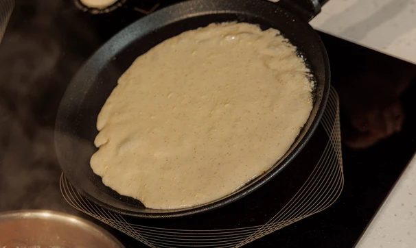 Смажьте сковороду растительным маслом и разогрейте. Налейте примерно половину половника теста и жарьте блин до румяности с двух сторон.