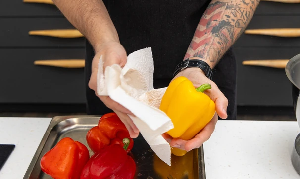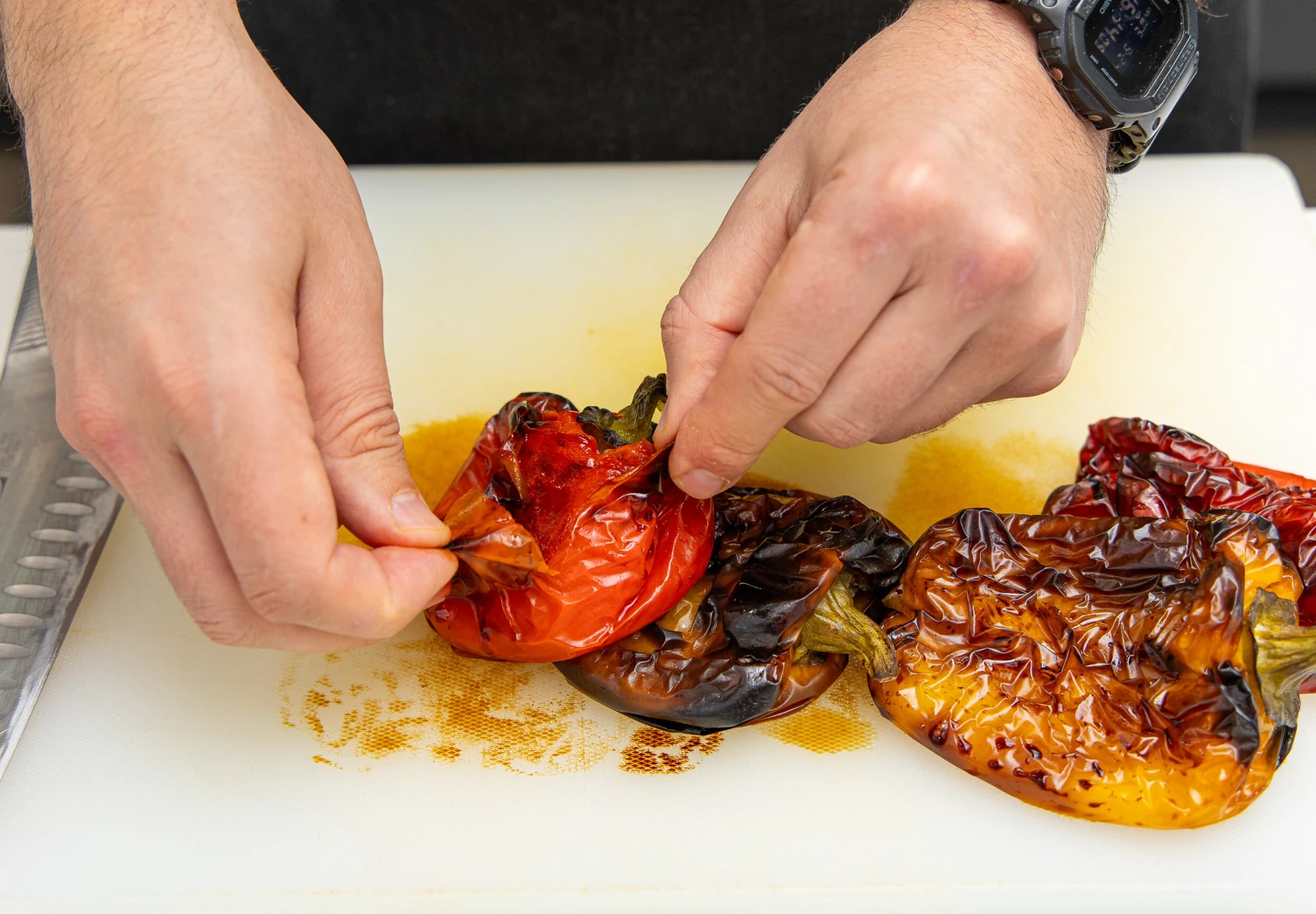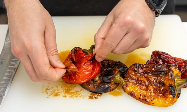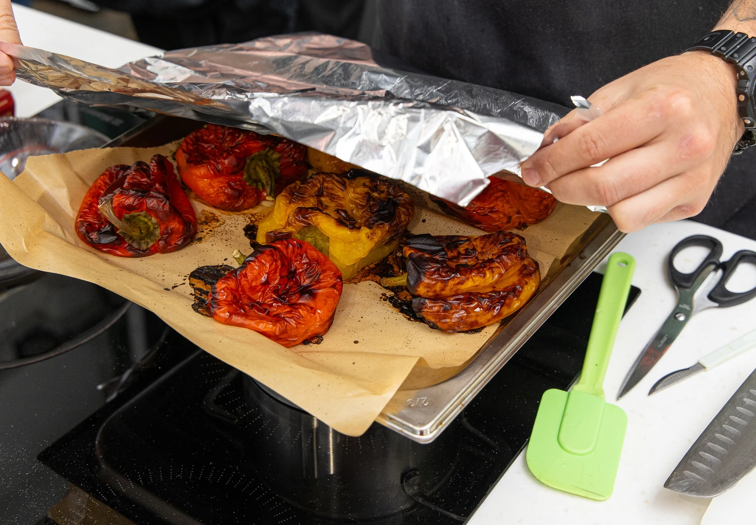 Готовые горячие перцы накройте фольгой и оставьте на 15–20 минут, чтобы остыли и пропарились.