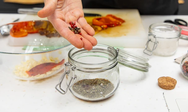 Пока перцы остывают, приготовьте маринад. Для этого смешайте растительное масло, уксус, ароматные травы, молотый перец и соль.