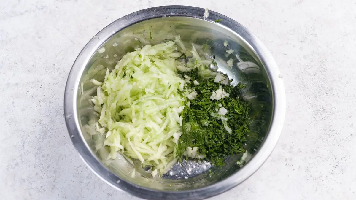 Огурцы очистите от кожуры и измельчите на средней тёрке, посолите. Укроп и чеснок мелко порубите и добавьте к огурцам.