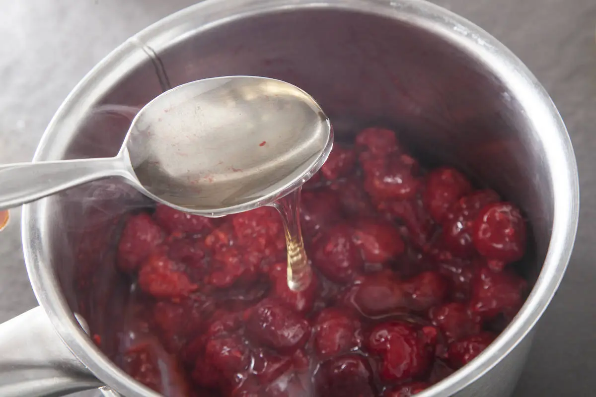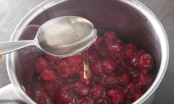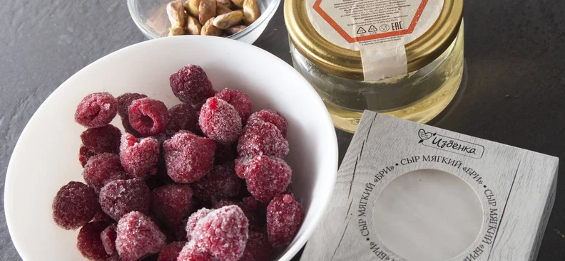 Разогрейте духовку до 200 градусов. Фисташки очистите от скорлупы и крупно порубите. Замороженную малину прогрейте в сотейнике с лимонным соком, в конце добавьте мед по вкусу и рубленые орехи, соус готов.