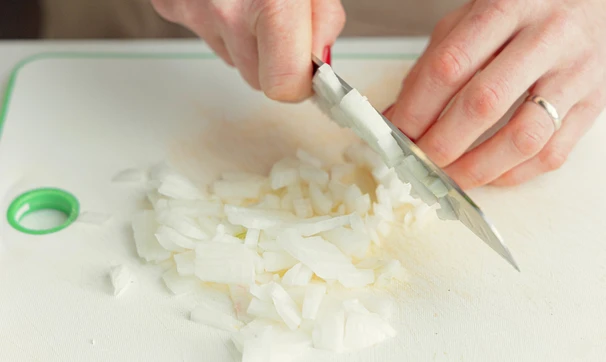 Лук нарежьте мелкими кубиками, чеснок измельчите.