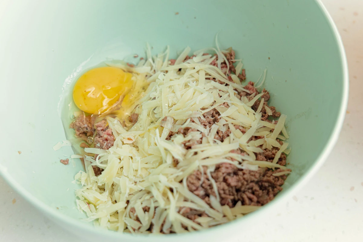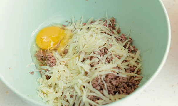 Обжаренный фарш с луком переложите в миску, добавьте тёртый сыр и вбейте одно яйцо, перемешайте.