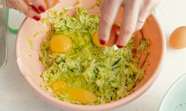 С тёртых кабачков слейте выделившийся сок, слегка отжав их. Вбейте 4 яйца и добавьте измельчённую зелень. Перемешайте.