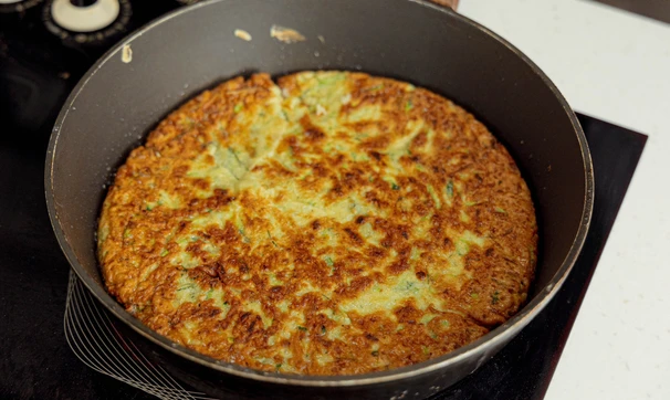 На сковороде с широким дном пожарьте блинчики из кабачкового теста с двух сторон.
