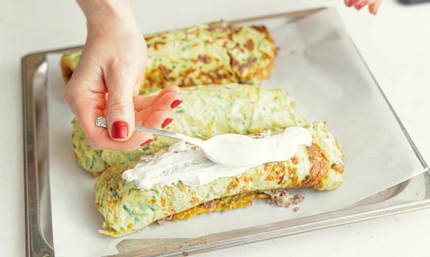 Запекайте рулетики в духовке в течение 20 минут при 180 °C. Можно смазать их сверху сметаной.