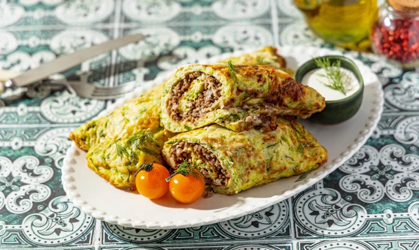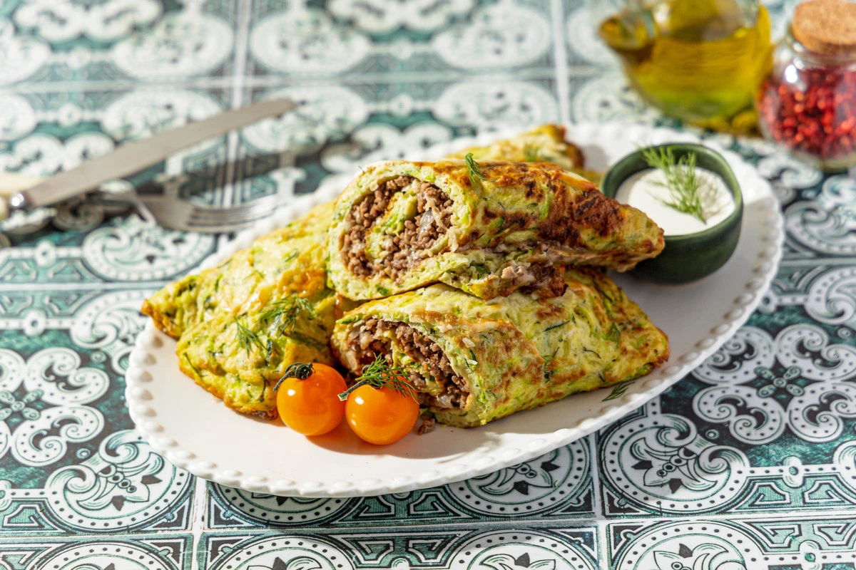 Не самое простое, но эффектное блюдо — зелёные рулетики с мясным фаршем в качестве начинки.