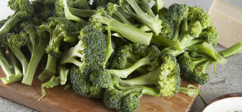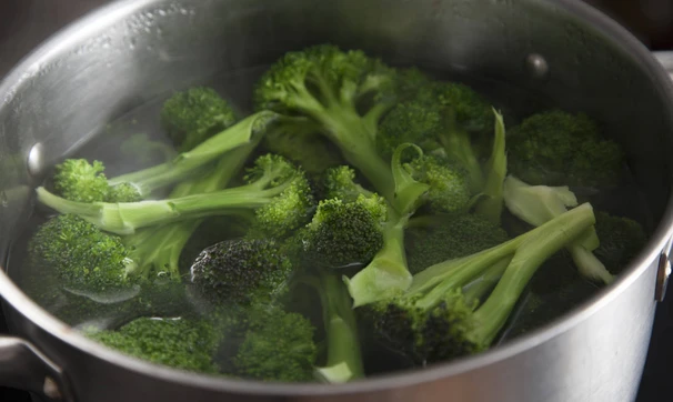 Вскипятите воду в большой кастрюле или сотейнике и бланшируйте брокколи в кипящей воде — 5 минут для свежей и 2-3 минуты для замороженной, откиньте на дуршлаг.