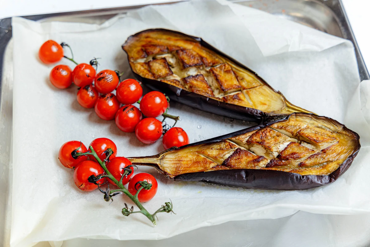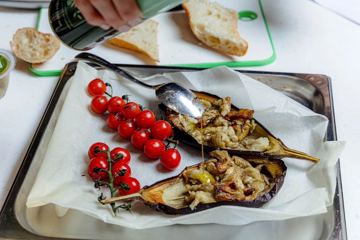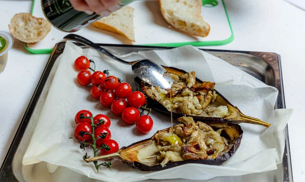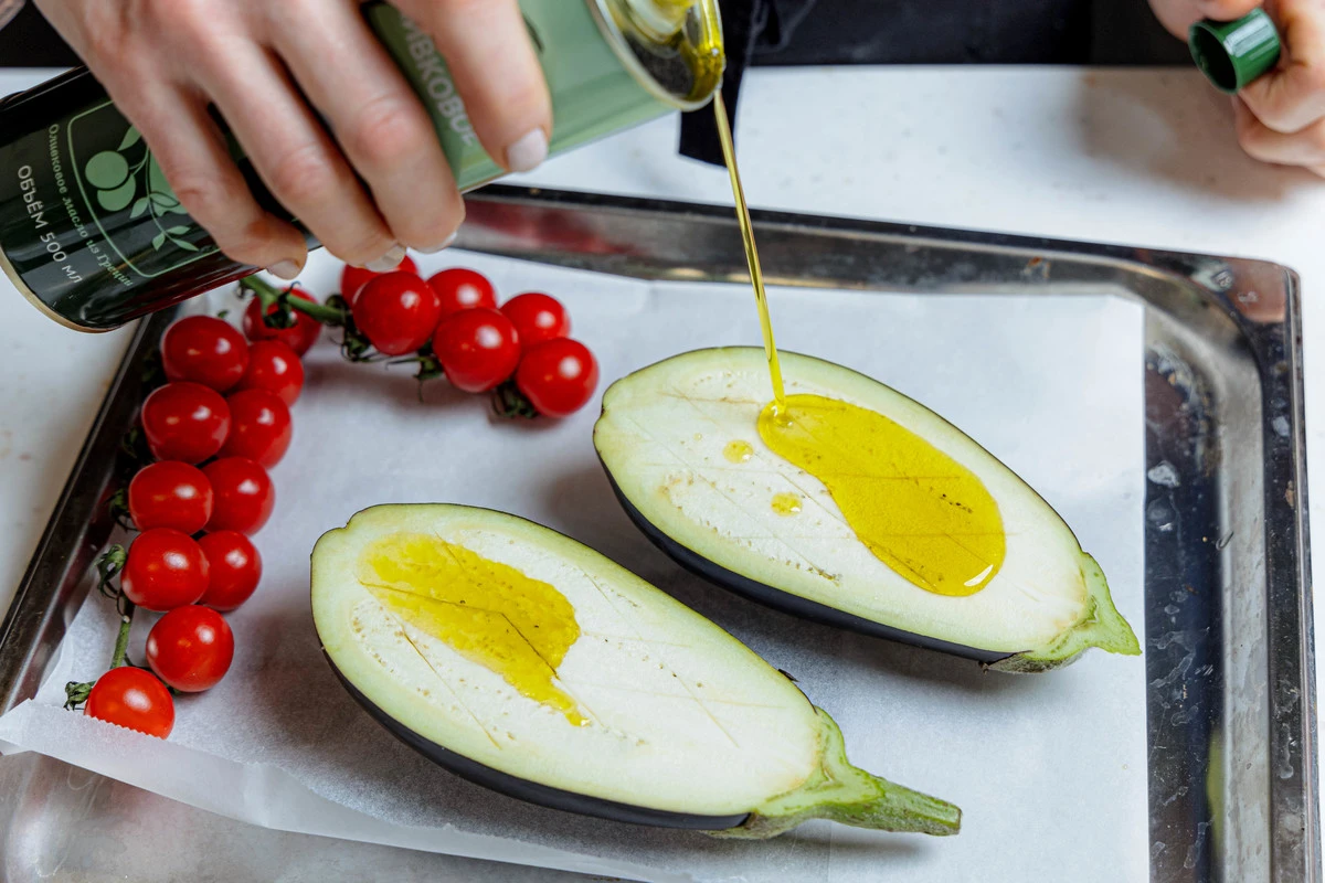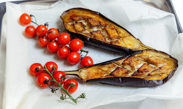 Баклажан разрежьте вдоль пополам, сделайте косые надрезы мякоти ножом, посолите, полейте оливковым маслом и поставьте в горячую духовку. Запекайте баклажаны при 180 °C около 15 минут до золотистости и мягкости.