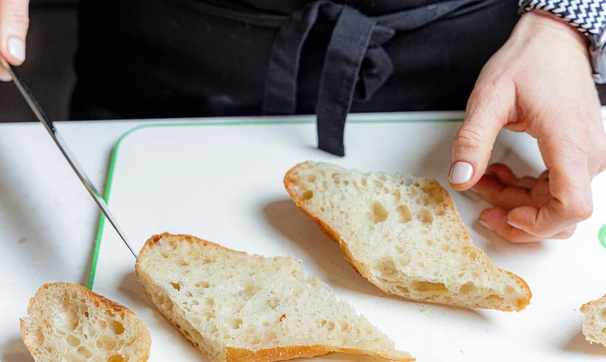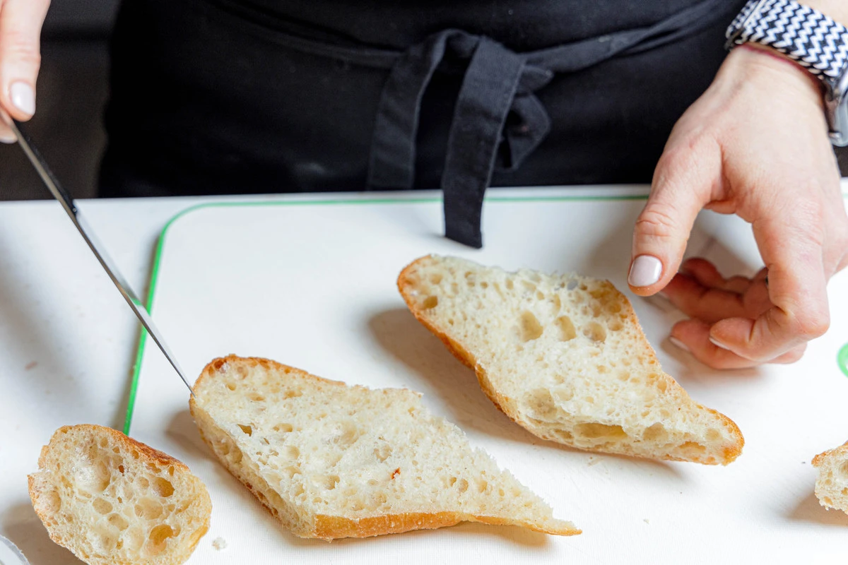 Багет разрежьте вдоль пополам, чтобы получились плоские длинные ломтики. Затем каждый разрежьте поперёк наискось. Получится 4 аккуратных ломтика с корочкой.