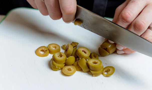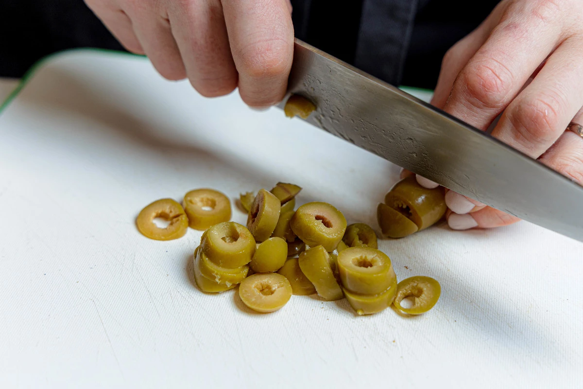 Оливки достаньте из рассола, нарежьте колечками.