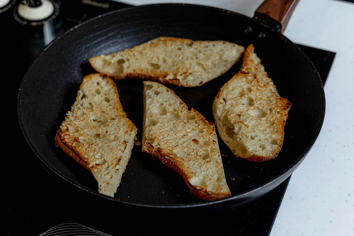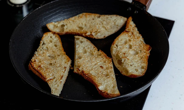 Подсушите ломтики хлеба в тостере или на сухой сковороде.