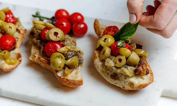 Брускетта — традиционная итальянская закуска перед основным блюдом. Сочетание баклажана, томатов и оливкового масла на хрустящем хлебе — конечно же, это очень вкусно.