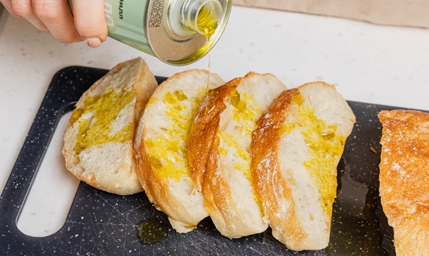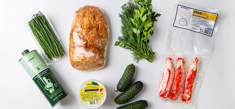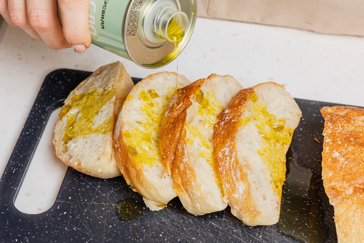 Заранее разморозьте краба. Чиабатту нарежьте ломтиками толщиной примерно 1-1,5 см. Полейте небольшим количеством оливкового масла.