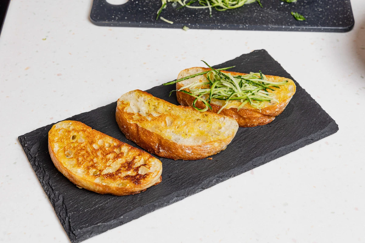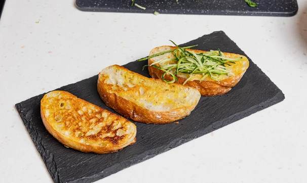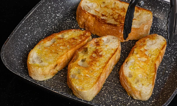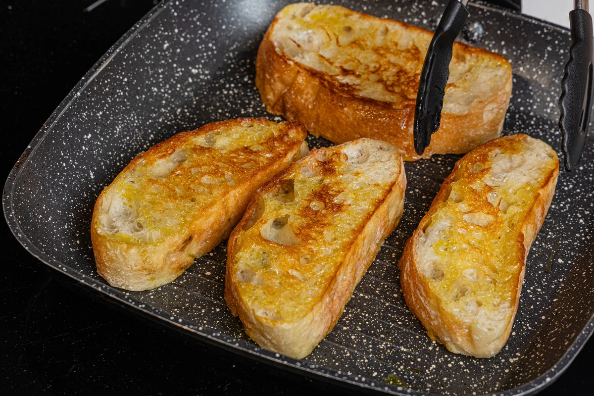 Обжарьте ломтики чиабатты на сухой сковороде до золотистой корочки.