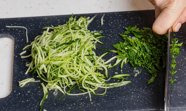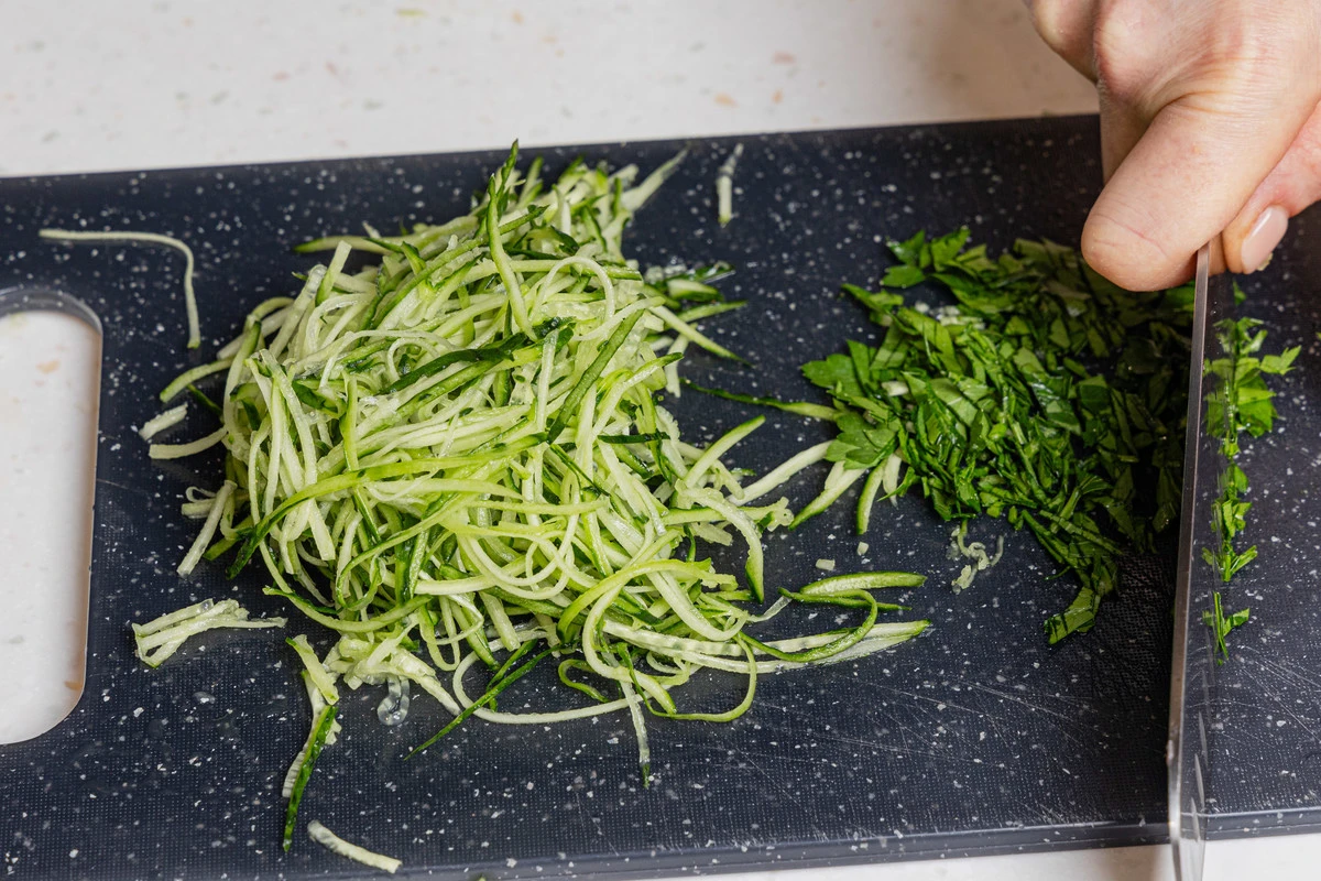 У огурца срежьте плодоножки и измельчите его на тёрке для корейской моркови. Петрушку мелко нарежьте.