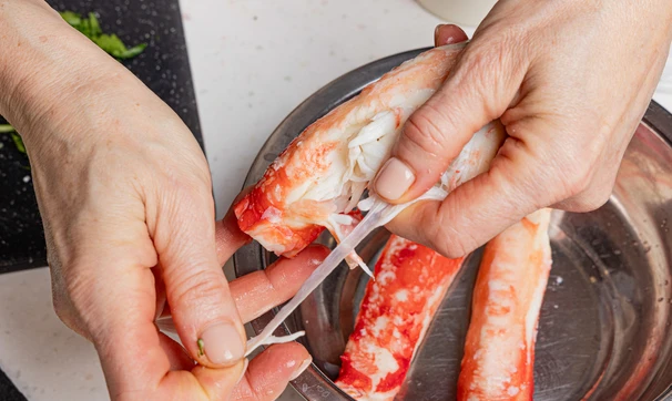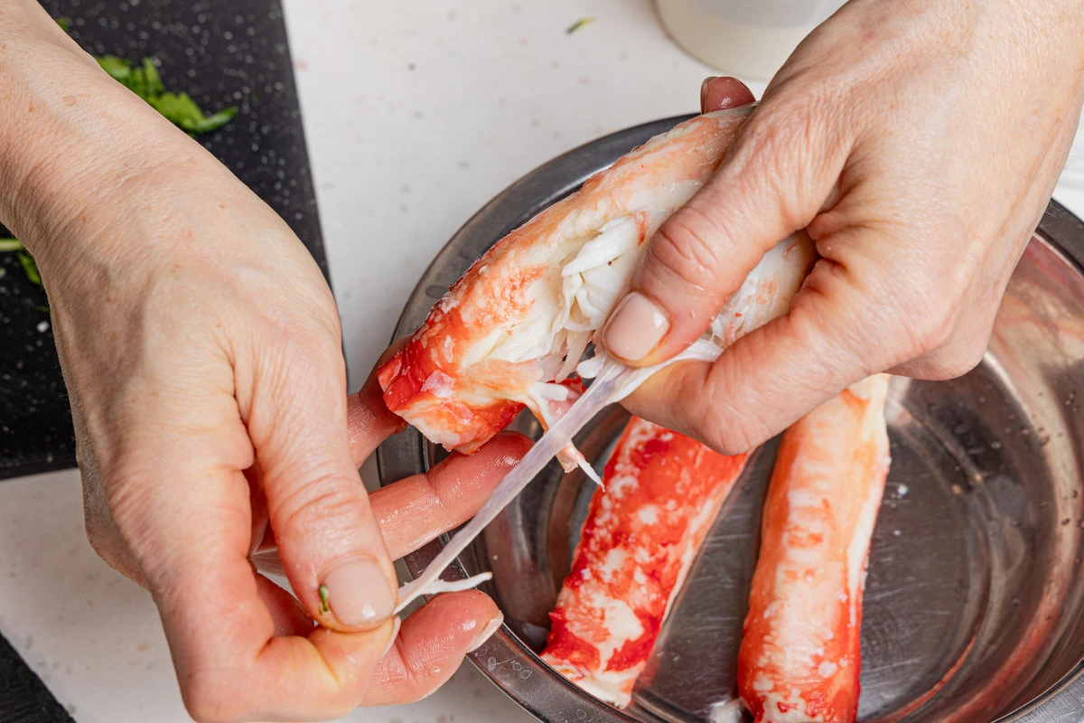 Фаланги краба очистите от хитиновых перегородок, нарежьте мясо краба кусочками.