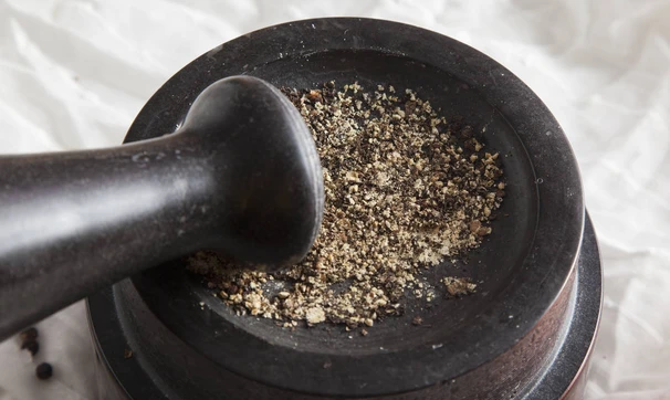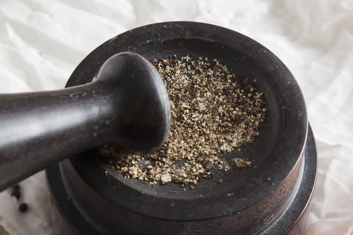 Горсть перца горошка растолките в ступке (или скалкой), немного крупнее, чем помол в мельнице.