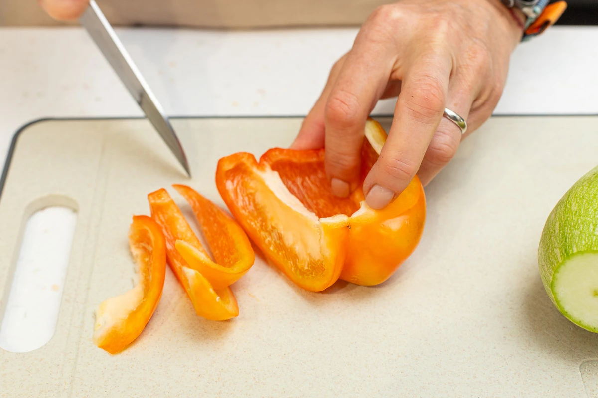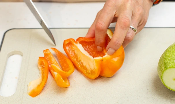 У перца отрежьте плодоножку, уберите семена. Нарежьте перец кубиками.