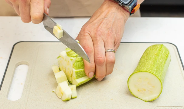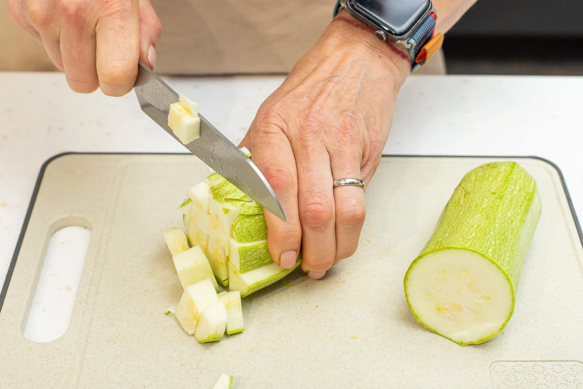 У кабачков срежьте плодоножки и нарежьте мякоть кубиками.