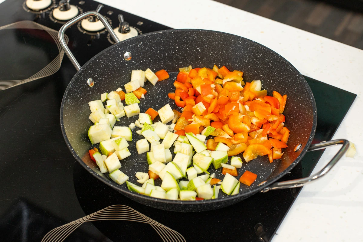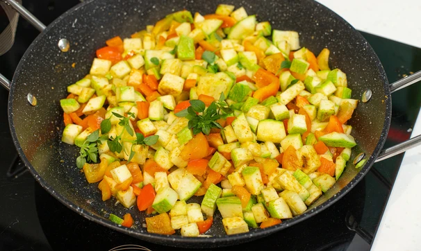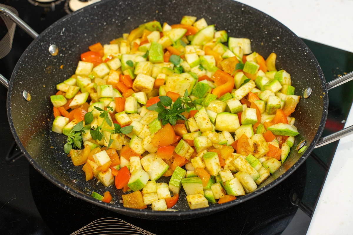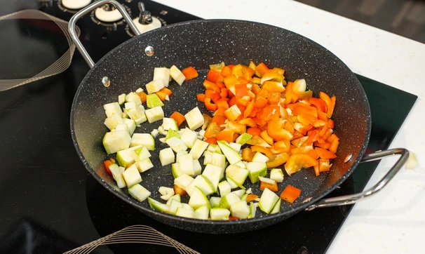 Разогрейте сковороду с растительным маслом. Выложите перец и кабачки и обжаривайте 5-7 минут.