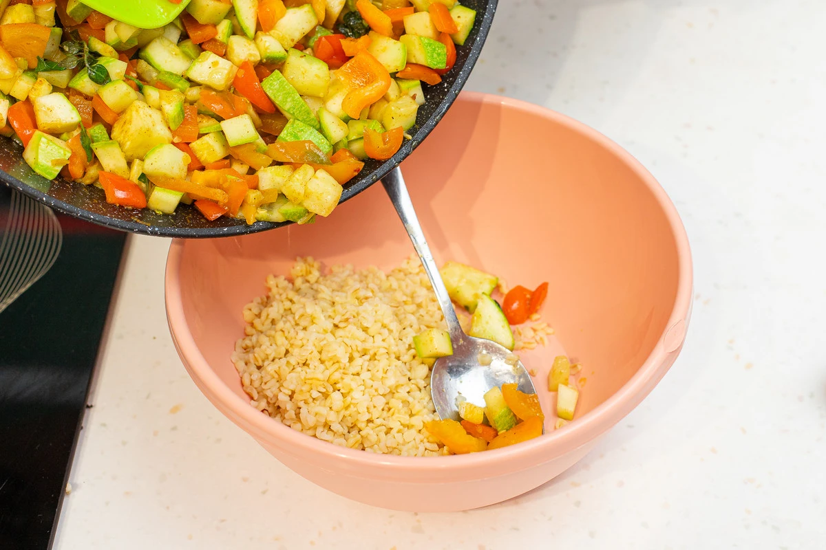 Смешайте овощи с булгуром. При подаче украсьте свежим базиликом.