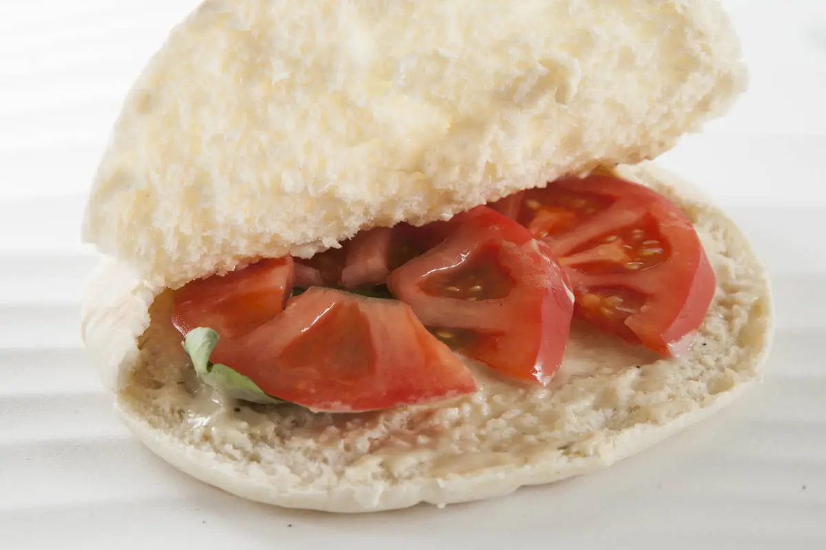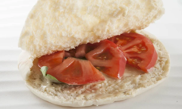 Намажьте нижнюю половинку соусом, выложите кружок помидора, листья базилика и горячую котлету, сверху полейте еще соусом, добавьте еще кружок помидора и листья салата, накройте вторым кусочком питы. Приятного аппетита!