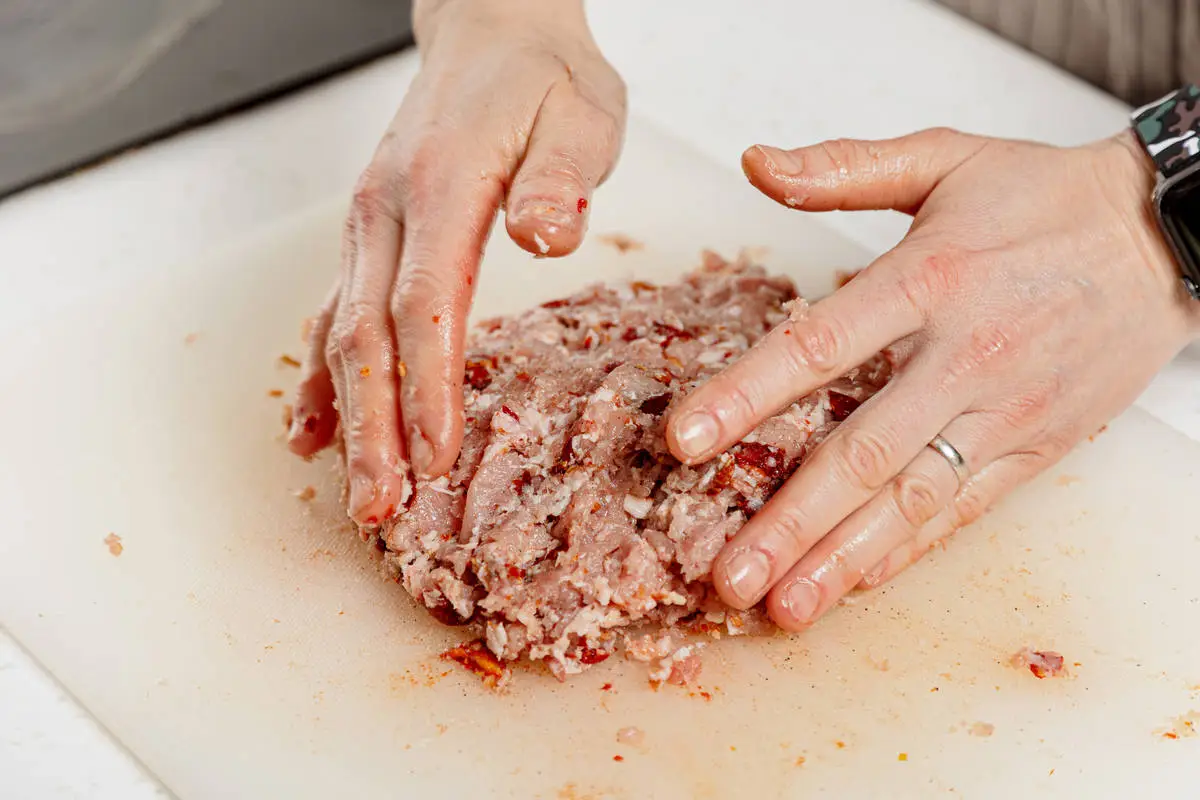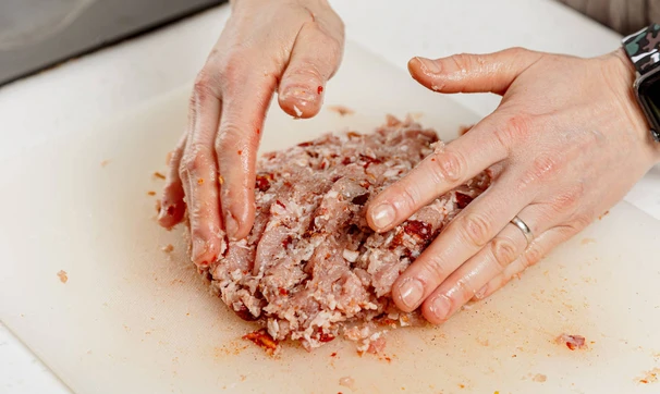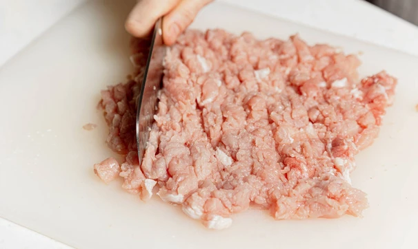 Свинину нарежьте полосками, а затем мелко нарубите ножом.