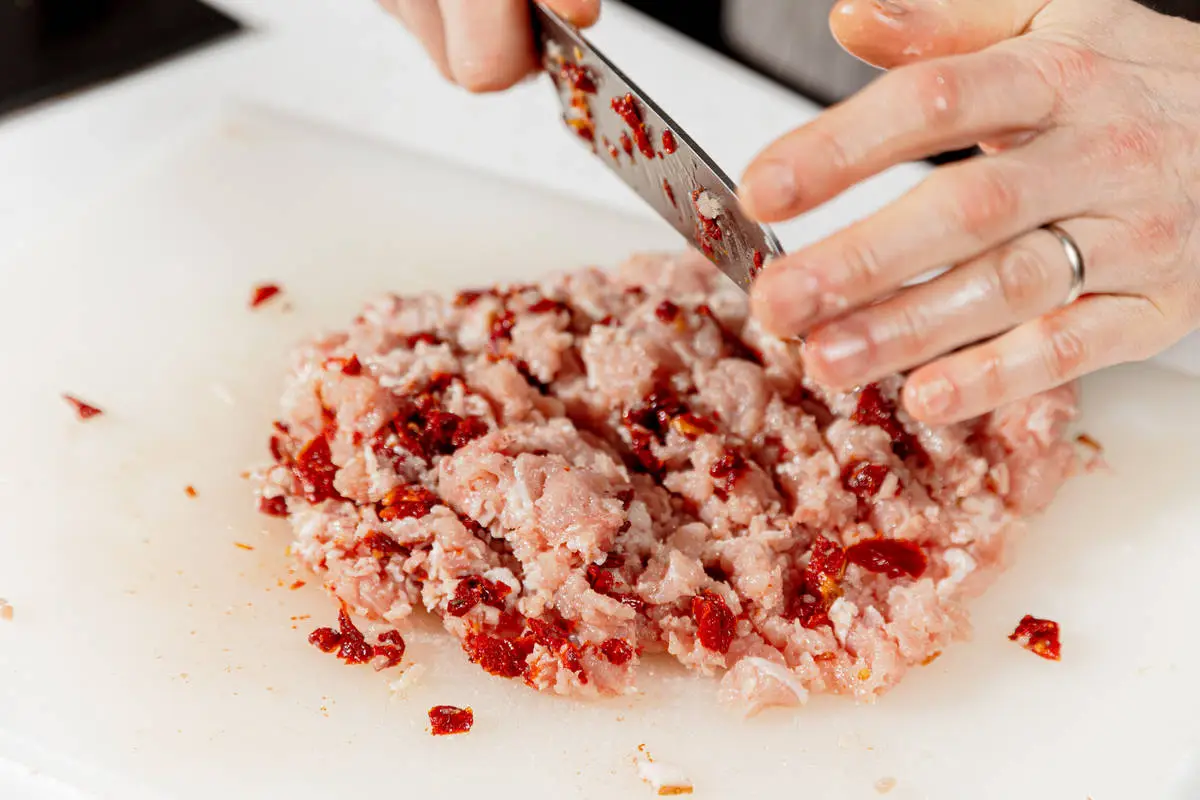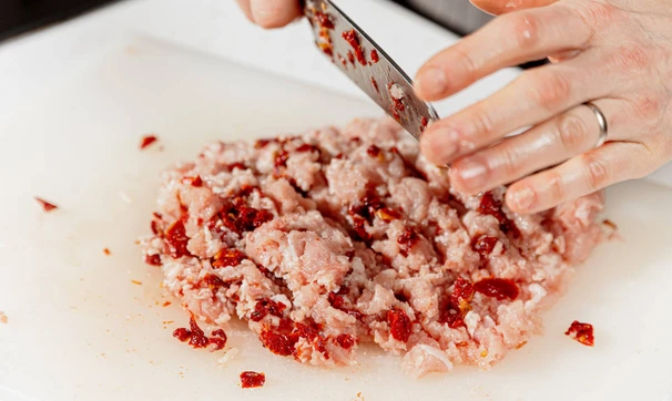 Бекон и вяленые томаты также мелко порубите, смешайте с мясом.