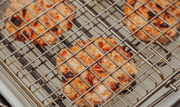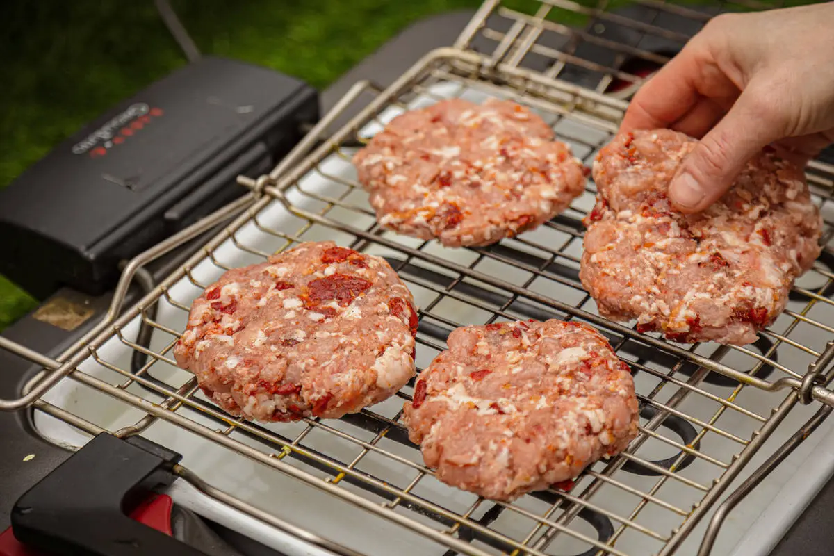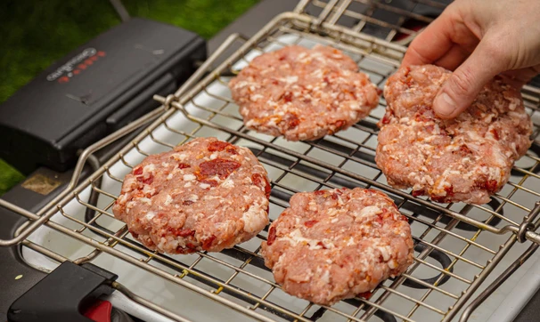 Спрессуйте 4 котлеты, пожарьте на гриле над углями или на сковороде-гриль.